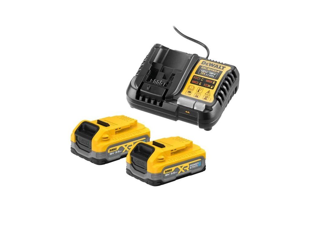 - Sada akumulátorů a nabíječky DCB1104S2 XR od značky Dewalt obsahuje 2 špičkové akumulátory DCBP318 XR POWERSTACK™ s kapacitou 3,5 Ah a napětím 18 V, spolu s rychlonabíječkou kompatibilní s celou řadou baterií DEWALT XR.
