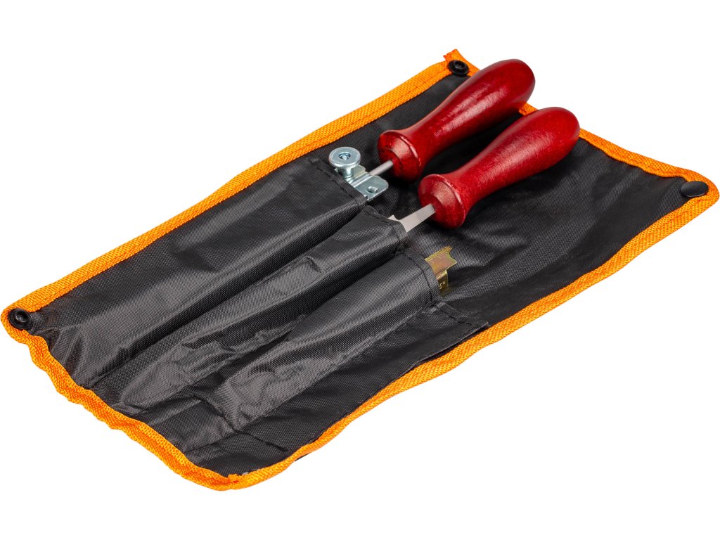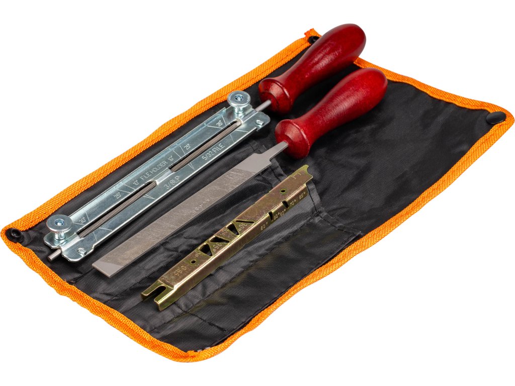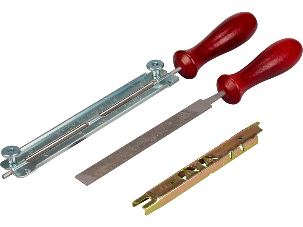 Vícedílná souprava pro ostření pilových řetězů v praktickém pouzdře, vhodná pro pilové řetězy s roztečí 1/4“ -3/8“ (6,35–9,32 mm) a šířkou vodicího článku 1,1–1,3 mm (0,043–0,050).